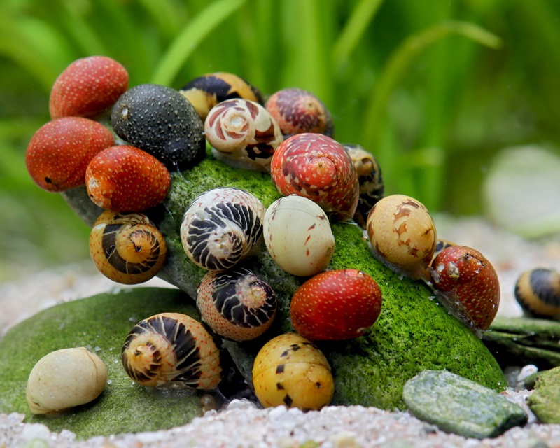 Denne smukke snegl kan ikke formere sig i akvariet, så den bliver ikke et skadedyr. Hunnerne lægger deres ægkokoner, men æggene klækkes til bittesmå larver, der skal have brakvand til havvand for at vokse op. Opdræt i et akvarium er derfor umuligt.