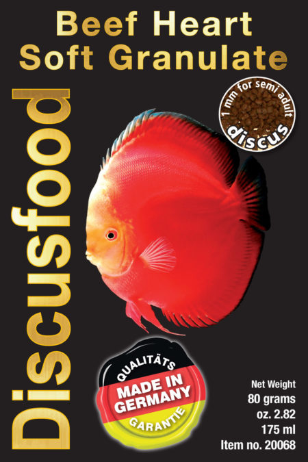 Discusfood Beef Heart Soft Granulat indeholder ca. 12% oksehjertekød og indeholder kun det bedste fra oksehjertet. Særlig omhyggelig produktion garanterer, at Discusfood Beef Heart Soft granulat næsten ikke indeholder bindevæv og hjertefedt. Discusfood Beef Heart Soft-Granulat er særligt kendetegnet ved sin bløde granulatstruktur, som accepteres af de fleste diskosfisk med det samme og ikke svulmer op i maven. Den specielle fremstillingsproces garanterer en fremragende fordøjelighed af foderet, som er meget højere i rå eller frosne oksehjerter. Det relativt høje proteinindhold og den afbalancerede tilsætning af vitaminer og mineraler sikrer en hurtig og afbalanceret vækst af diskosfisk. Granulatkornstørrelsen er ca. 1,2 – 1,5 mm. Ideelt velegnet til alle små og mindre diskosfisk.