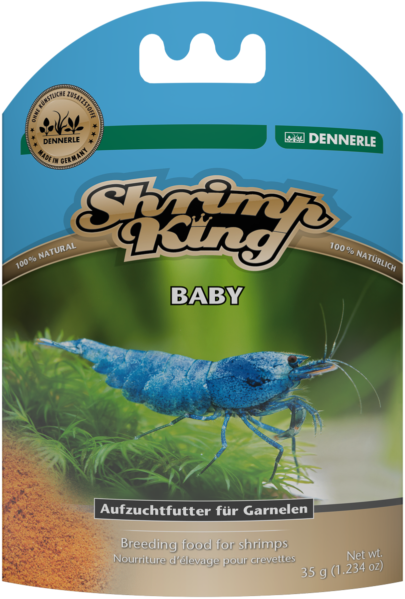 Shrimp King Baby sikrer desuden problemfri fældning og styrker kroppens eget forsvar. Babyrejer bliver ofte på deres rugeri i flere dage efter udklækningen. Hvis der ikke er mad nok på dette tidspunkt, kan de hurtigt sulte ihjel. Shrimp King Baby er derfor formuleret som mikrogranulat med en kornstørrelse på ca. 1 mm. Mikrogranulerne er (a) vandstabile og (b) forsvinder ikke ind i substratet eller filtre såsom støvforing. Det undgår derfor unødig vandforurening og bliver ikke grumset. Shrimp King Baby er ideel til daglig fodring og velegnet til alle larvestadier, især til de følsomme første par uger.