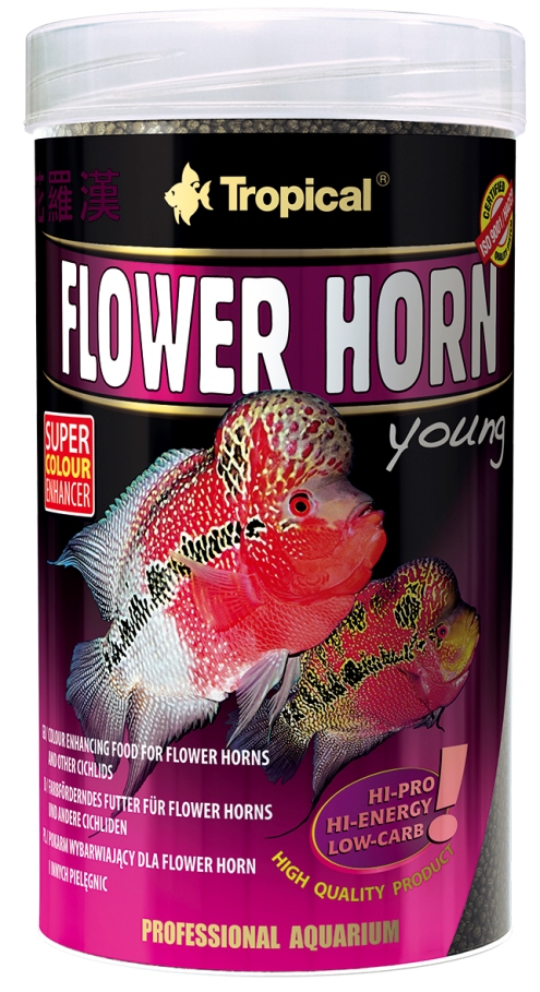 Tropical Flower Horn Young Pellet er et multiingrediens, farveforstærkende foder i form af flydende pellets til daglig fodring af unge blomsterhornscichlider og unge fisk af andre store arter af cichlider. Højt indhold af protein samt umættede fedtsyrer (Omega-3, Omega-6) sammen med det lave indhold af kulhydrater fremmer vækst og udvikling hos fisk, hvilket forhindrer fedtdegenerering af deres indre organer. Tilsætningen af naturlige carotenoider, herunder astaxanthin, intensiverer farven og forbedrer den generelle tilstand. Maden er usædvanlig velsmagende og går ikke i opløsning i vand. Tilsætningen af zeolit fremmer et sundt fordøjelsessystem og frigivelsen af toksiner fra fiskens kroppe.