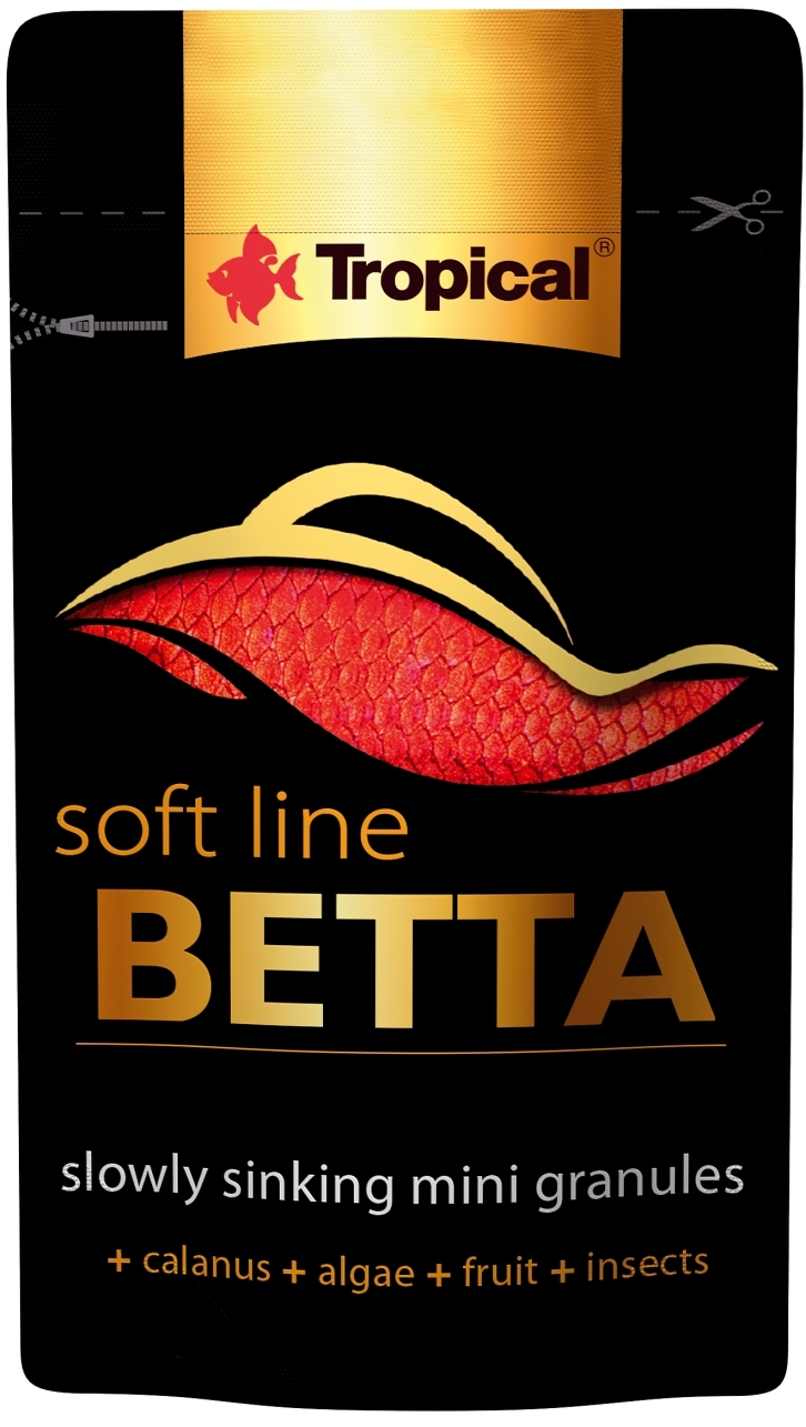Tropical Soft Line Betta er et blødt foder i form af langsomt synkende minigranulat til bettas og andre små arter af labyrintfisk, indeholder sild og insekter, som er kilden til protein af høj kvalitet og Omega-3, Omega-6 og Omega-9 fedtsyrer. Tropical Soft Line Betta intensiverer fiskens farve takket være det høje indhold af carotenoider fra krebsdyr (inklusive calanus) og rød peber og naturlig astaxanthin. Høj dosis beta-glucan forbedrer fiskens immunitet. Enestående madsmag tilskynder fisk til at fodre