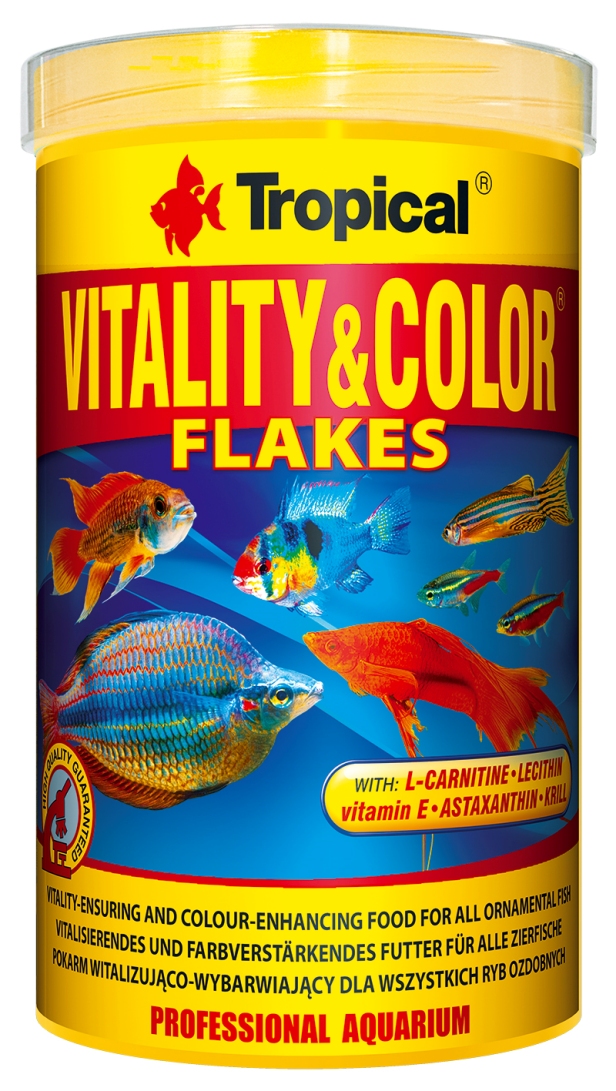 Tropical Vitality & Color er et komplet, specielt, meget nærende, farveforstærkende flagefoder til alle akvariefisk. Indholdet af lecithin og E-vitamin stimulerer gydning og øger aktivitetsniveauet. Værdifuld L-carnitin forbedrer fedtforbrændingsprocessen. Samtidig har det høje indhold af let assimilerbare carotenoider (herunder astaxanthin og beta-caroten) en positiv indflydelse på farvningen ved at aktivere pigmentceller. Tilsætningen af zeolit fremmer et sundt fordøjelsessystem og frigivelsen af toksiner fra fiskens kroppe.