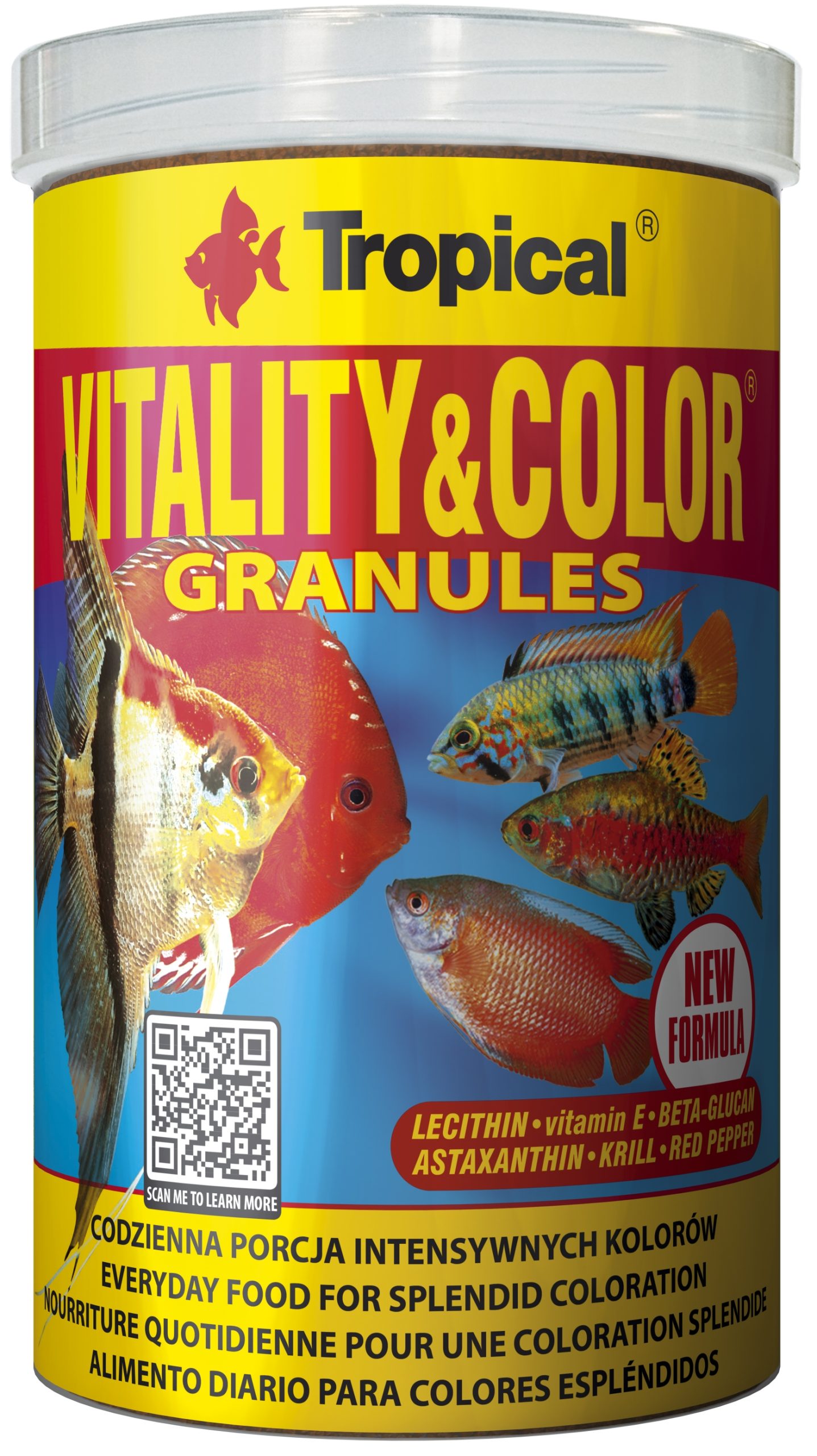 Tropical Vitality & Colour Granules er et højt-protein, langsomt synkende granuleret foder med farveforstærkende og vitalitetsfremmende egenskaber til altædende og kødædende akvariefisk, der lever i vand eller i bunden. Anbefales især til fisk i perioder med intensiv vækst eller reproduktion og til opdrættede fisk, der kræver farveforbedring. Højt proteinniveau samt lecithin og E-vitamin stimulerer reproduktionen og fremmer vækst og modning. Astaxanthin og andre naturlige carotenoider fra krill (8%), rejer (10%) og rød peber forbedrer fiskens farve, modning og generelle tilstand. Tilsætningen af L-carnitin i Tropical Vitality & Color Granules hjælper fisken til bedre at udnytte de fedtstoffer, der findes i maden. Præbiotika fremmer udviklingen af en sund bakterieflora i mave-tarmkanalen. Eatural immunstimulator beta-glucan forbedrer fiskens immunitet.